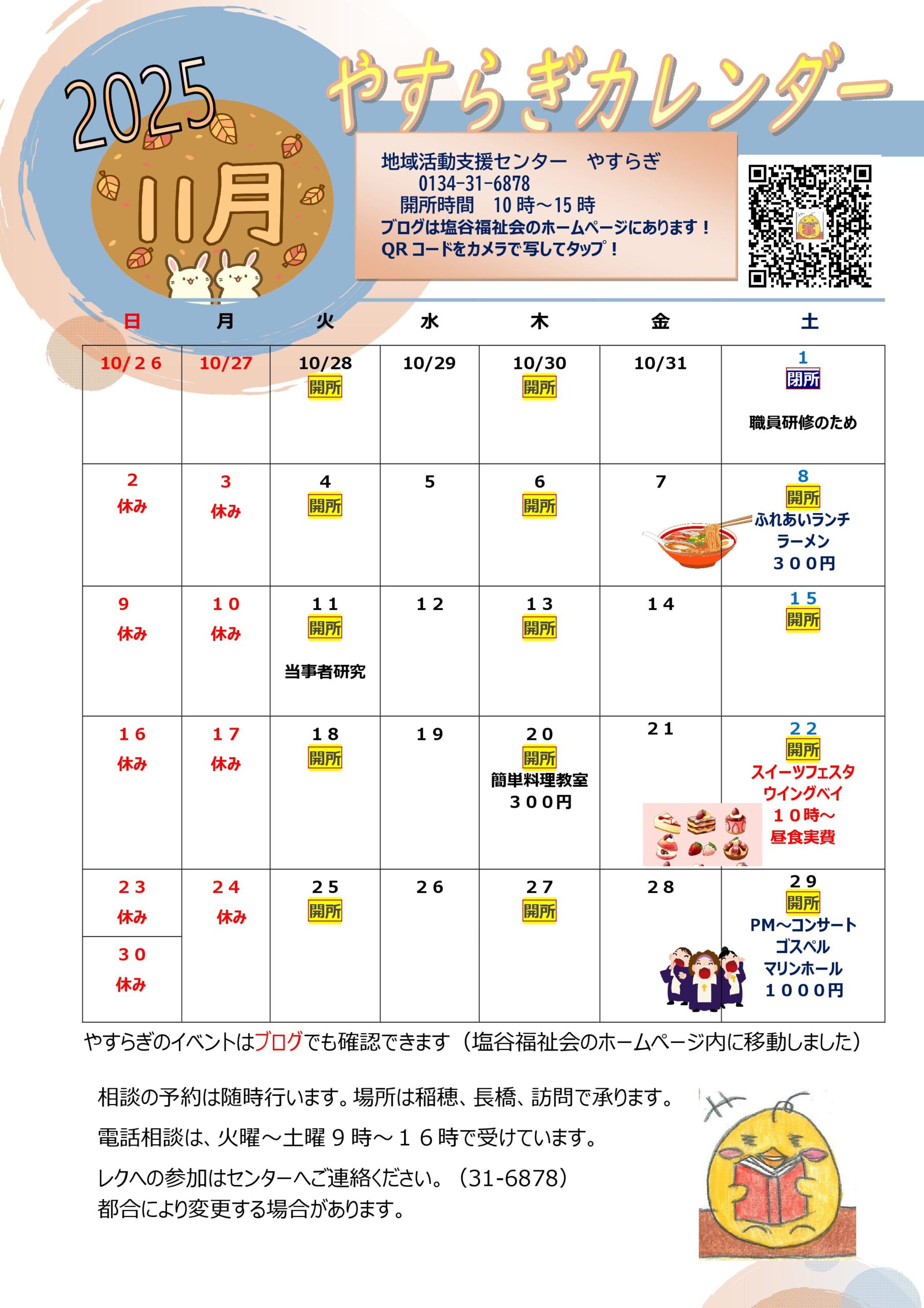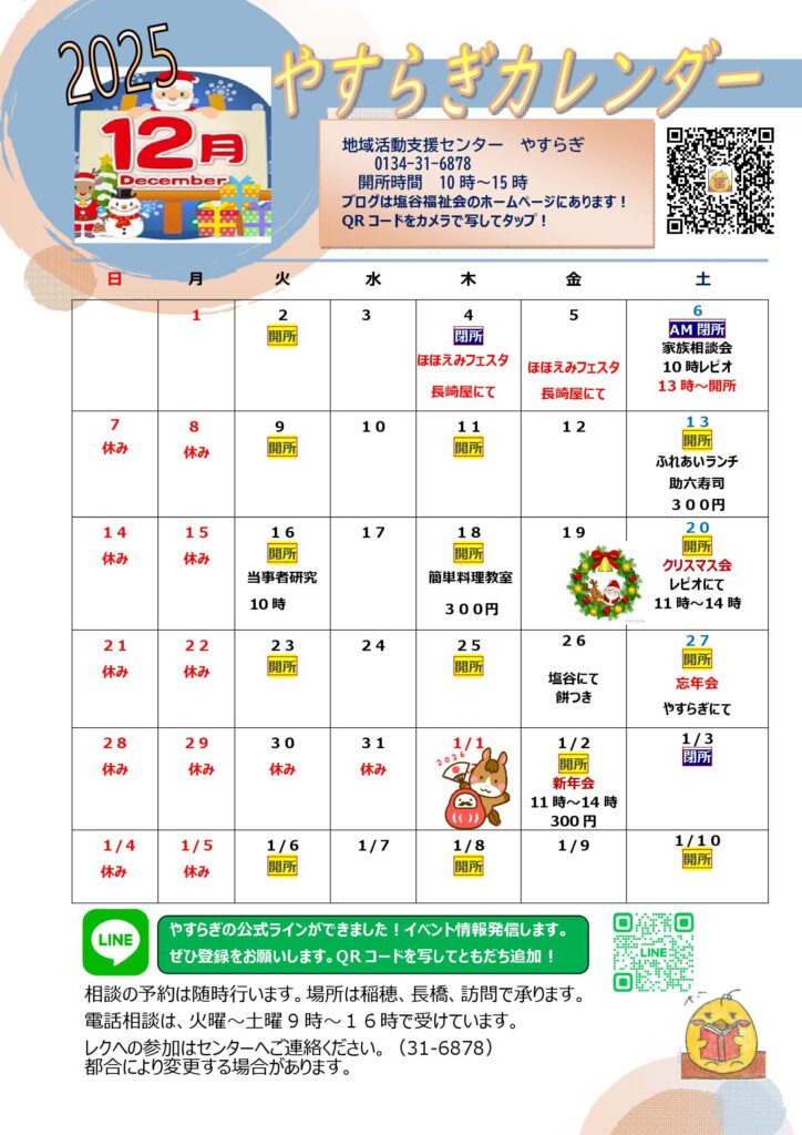 カレンダー 2025.11.24 2025.11.25 やすらぎカレンダー12月アップしました! 2025年もいよいよ最後の月になります。12月もレク盛りだくさん。ぜひご参加ください。 やすらぎの公式ラインができました!ぜひともだち登録お願いします。 https://lin.ee/ExAM5XbC クリスマス会の申し込みは12月10日までとなっています。くれぐれもお忘れなく。 やすらぎカレンダー11月アップしました! 前の記事